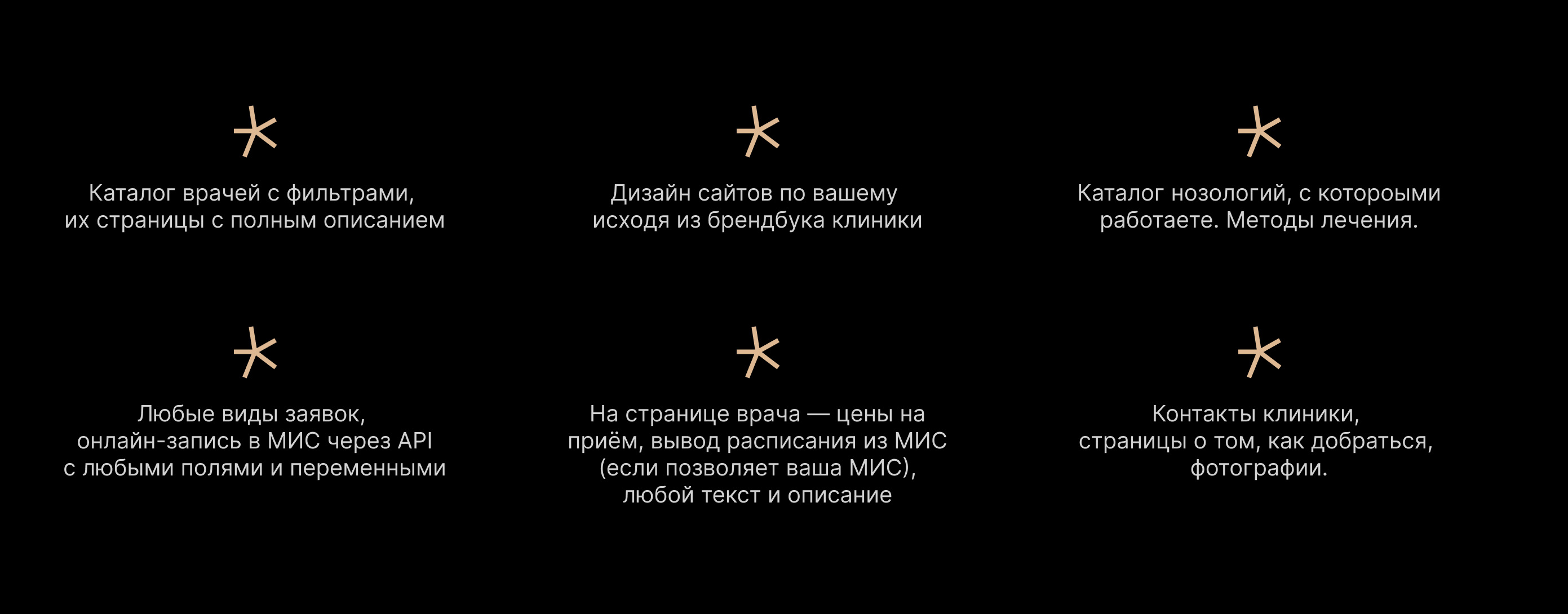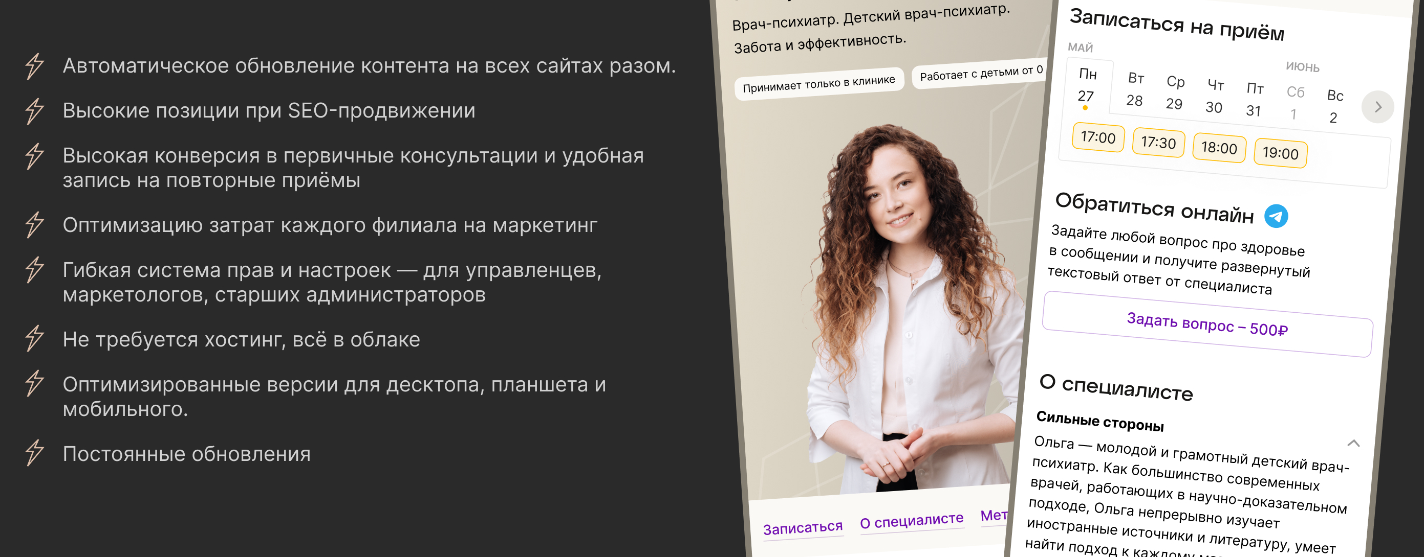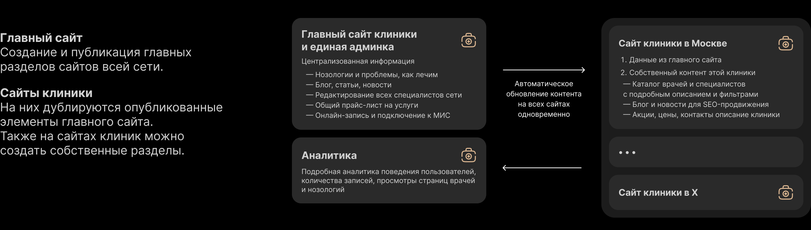 сеть сайтов для клиник с мастер-сайтом и контролем метрик. Гибкий конструктор готового сайта для федеральных сетей клиник, стоматологий и салонов красоты.